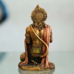 A small statue depicting the Hindu deity Hanuman, sitting in a devotional pose. The statue is made of copper and has a polished finish. Hanuman is a monkey god who is known for his strength, devotion, and intelligence. He is a popular figure in Hinduism and is often worshipped for his ability to protect from evil and bring good luck.